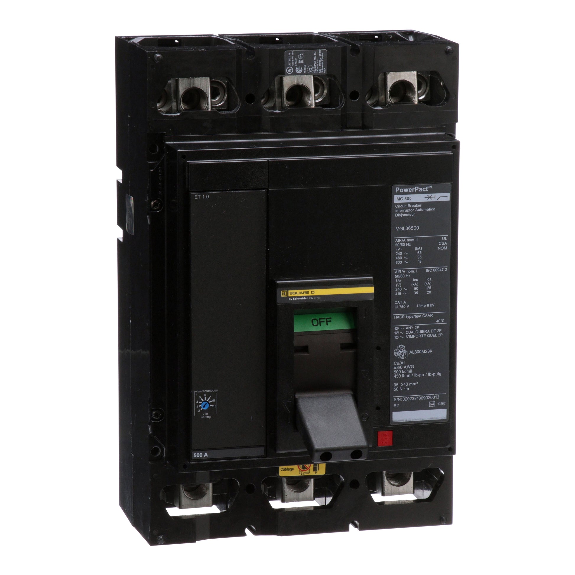 interruptor electrónico PowerPact-M 500A 18kA 600V, zapatas Interruptor automático de zapatas PowerPact marco-M de Square D. Funciones de protección (electrónico ET1.0) y switcheo en tableros de control Schneider MGL36500